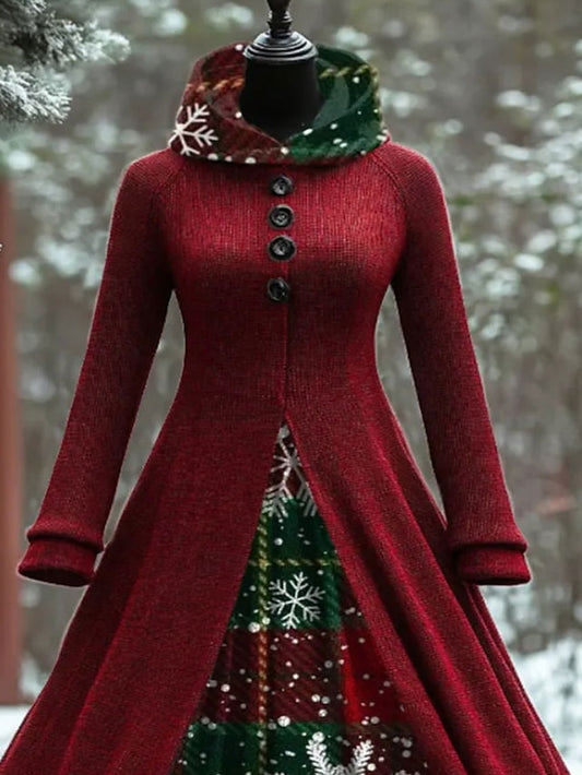 Elegant Red Christmas Maxi Dress for Women – Vintage A-Line Hooded Design with Geometric Snowflakes for Fall & Winter