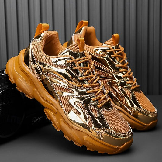 Men's Casual Patent Leather Sneakers - Comfortable, Slip-Resistant & Breathable Lace-Up Footwear in Black & Gold for All Seasons