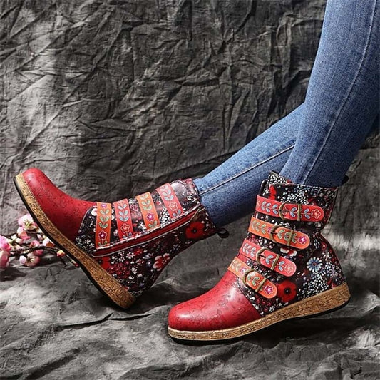 Stylish Plus-Size Women’s Combat Boots with Embroidery - Vintage Faux Leather in Red and Blue