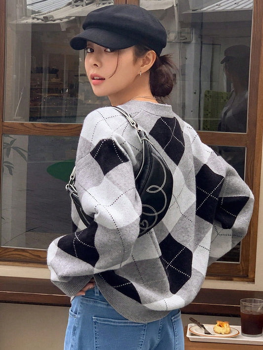 Stylish Argyle Pattern Drop Shoulder Cardigan for Women – Perfect for Spring and Fall Casual Wear