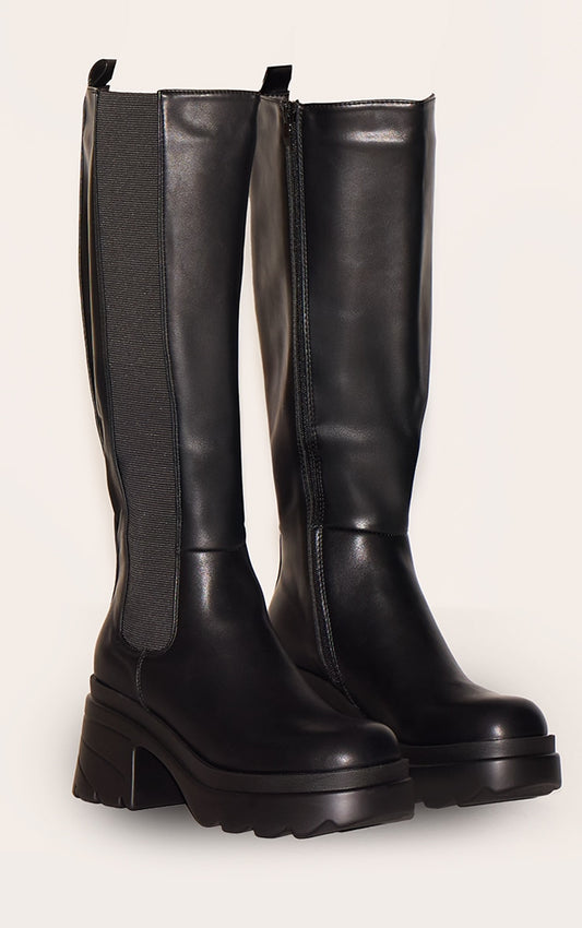 Trendy Black PU Chunky Chelsea Heeled Knee High Boots for Effortless Style