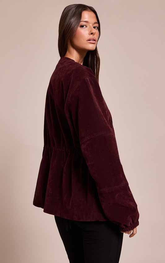 Burgundy Structured Faux Suede Jacket with Pocket Detail and Adjustable Waist