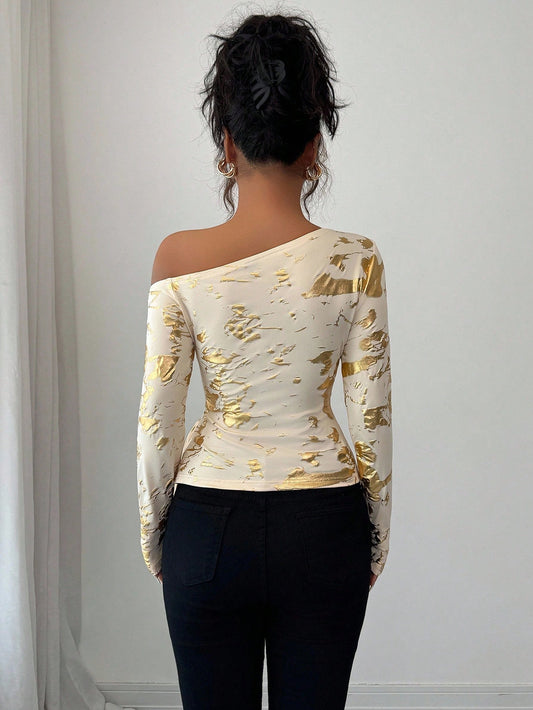 Elegant Gold Foil Asymmetric Long Sleeve T-Shirt for Women – Fall Fashion Essential