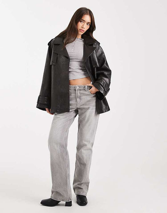 Chic Black Faux Leather Mid-Length Trench Coat Effortless Style