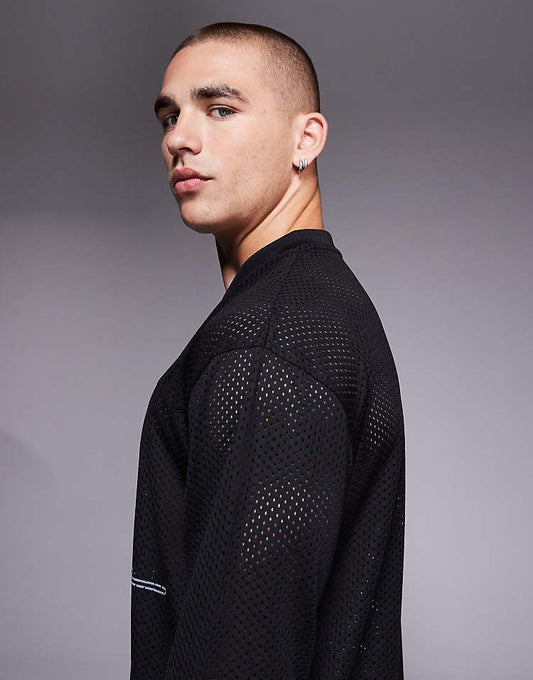 Relaxed Long Sleeve Sports Graphic T-Shirt in Washed Black Airtex