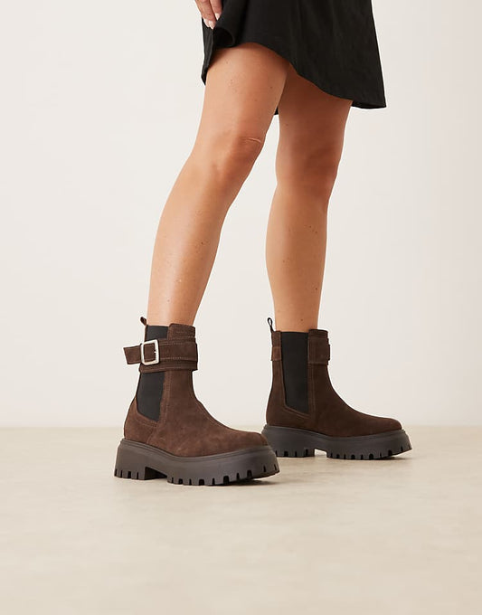 Astrid Chunky Chelsea Boots with Buckles in Luxurious Chocolate Suede