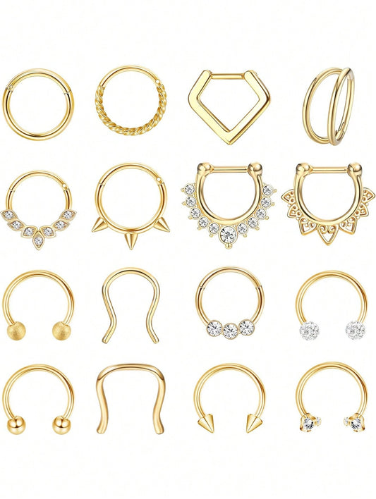 Hypoallergenic Milacolato Septum Rings Set - 16G Surgical Steel Clicker Nose Hoops for Men & Women - 16 Pcs in Gold, Silver, and Black