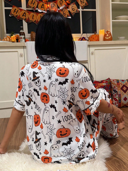 Spooktacular Women's Halloween Pajama Set with Bat, Ghost, and Pumpkin Print - Perfect Sleepwear for a Cozy Halloween Night