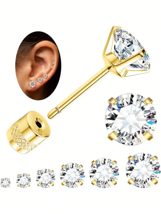 Hypoallergenic Threadless Flat Back Stud Earrings Set - 6 Pairs of Surgical Stainless Steel & Cubic Zirconia for Women and Men
