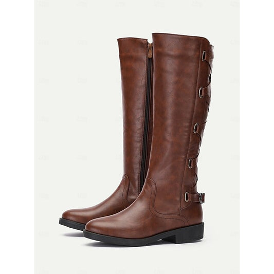 Stylish Women's Leather Knight Boots - 2022 Winter Lace-Up Long Boots with Belt Buckle in Large Sizes