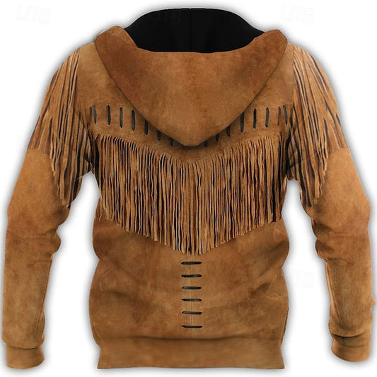 Men's Brown Full Zip Hoodie Jacket with Graphic Prints - Stylish Sportswear for Spring and Fall