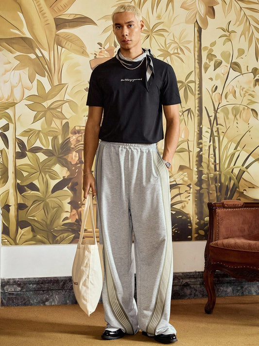 Men's Casual Wide Leg Sweatpants with Embroidered Lettering and Drawstring Waist