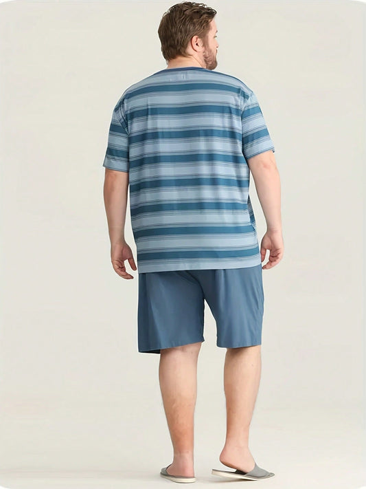 Plus Size Men's Blue Striped T-Shirt and Matching Pure Blue Shorts Pajama Set for Comfortable Loungewear