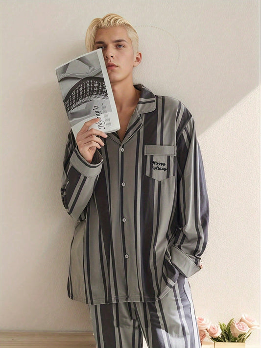 Stylish Men's Pajamas Set - Long Sleeve Lapel Cardigan with Vertical Stripes for Cozy Loungewear