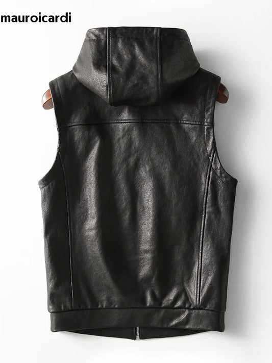 Mauroicardi Spring Autumn Luxury Elegant Cool Black Pu Leather Vest for Men with Hood Zipper Sleeveless Jacket Men Clothing 2023