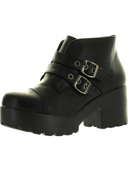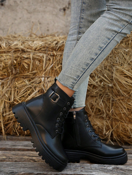 Stylish Women's Round Toe Platform Chunky Ankle Booties with Buckle Strap and Side Zip