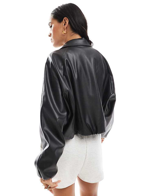 Sleek Black Faux Leather Cropped Bomber Jacket for a Chic Urban Look