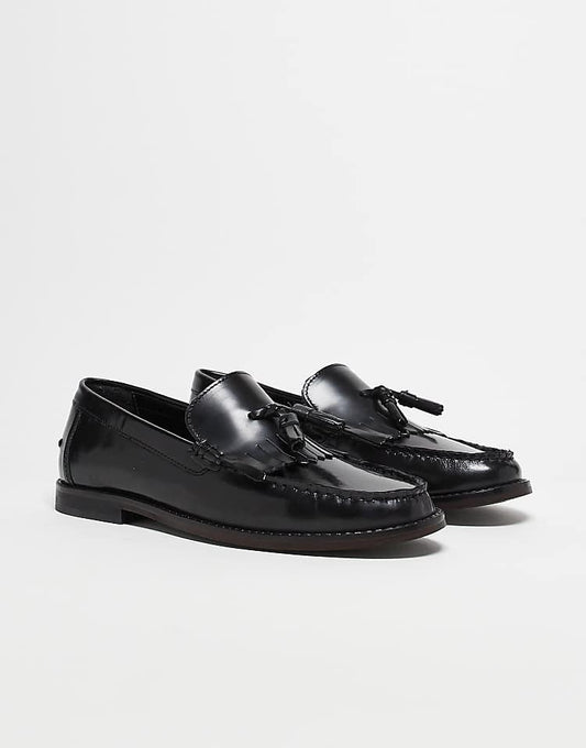 Stylish Polished Black Leather Loafers with Fringe Detail for a Chic Look