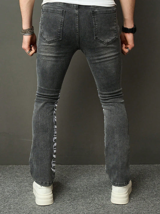 Stylish Men's Cotton Ripped Jeans with Letter Patches and Contrast Tape - Trendy Black Graphic Denim