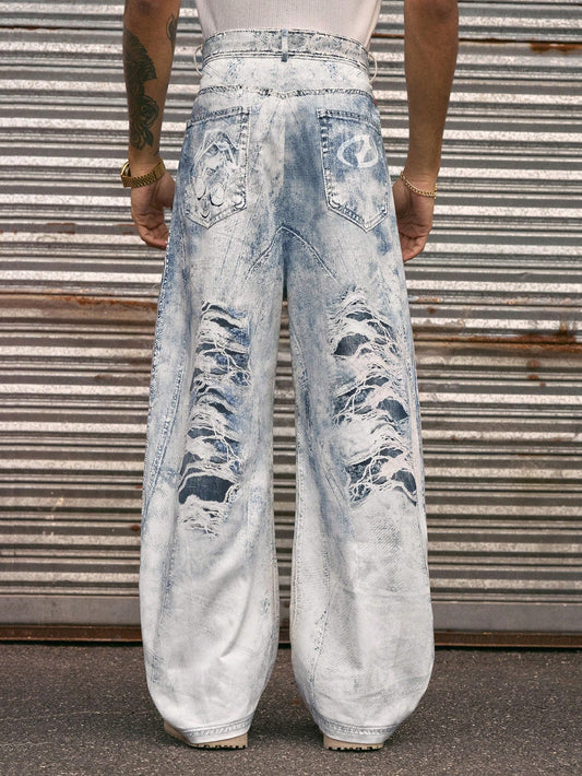 Trendy Men's Distressed Wide Leg Jeans with Stylish Washed Effect