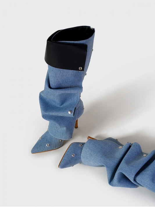 Elegant Solid Color Fashion Boots High Heel Pointed Toe Zipper Suede Knee High Lace-Up