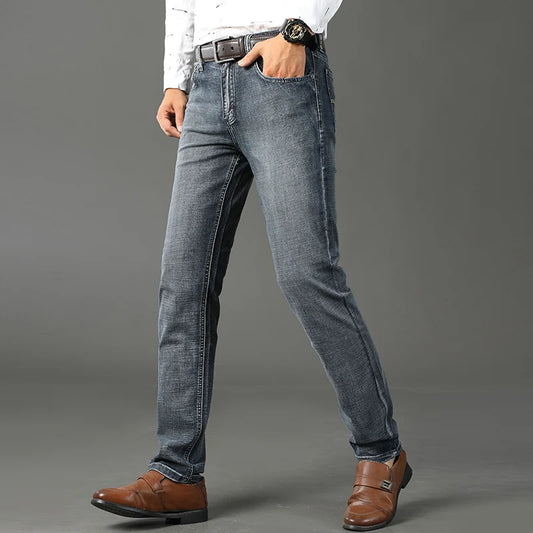 Men Classic Jeans Straight Regular Blue Stretch Denim Trousers Men's