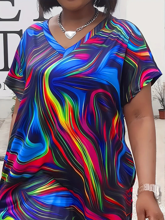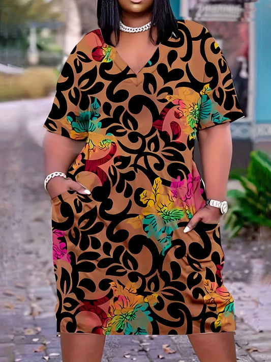 Large Size Casual Floral Print Patchwork V-neck Straight Dress