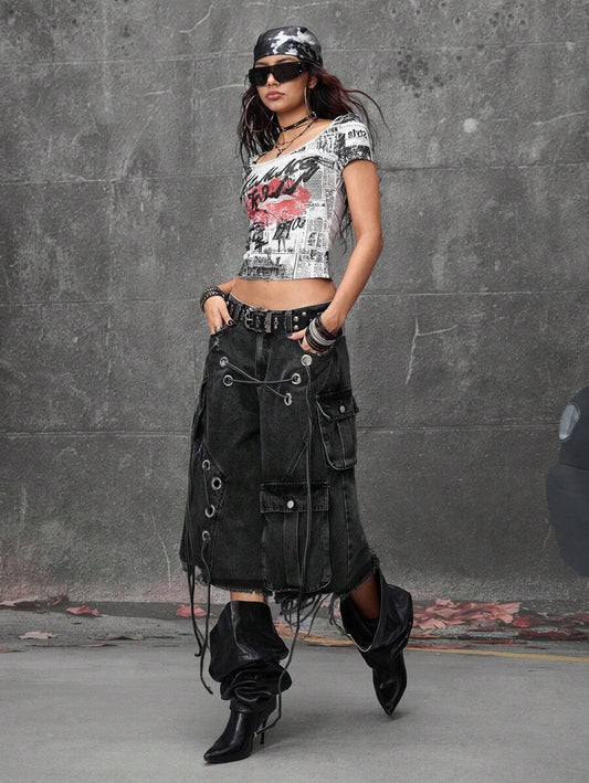 Trendy Grunge Punk Distressed Denim Shorts for Women - Loose Low Rise Mid-Length Style
