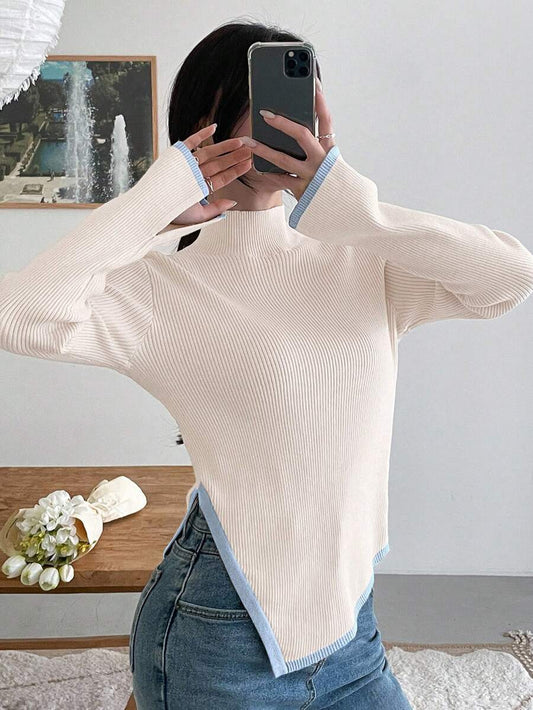 DAZY Women's Autumn Asymmetric Slit Flare Sleeve Sweater in Trendy Contrast Colors