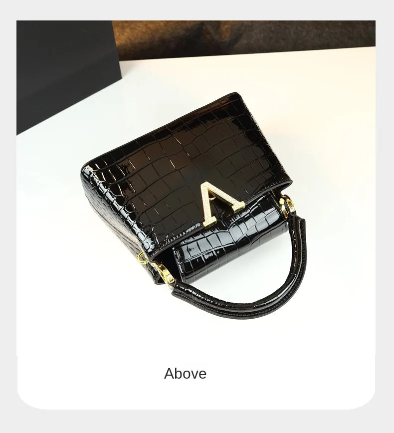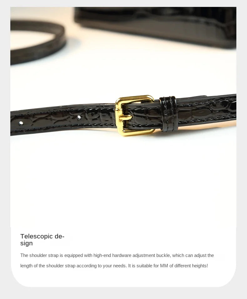 Introducing the 2025 Crocodile Pattern Leather Handbag. Crafted with luxury and fashion in mind, this compact shoulder bag is perfect for the modern woman on-the-go. Its portable design and crossbody style make it easy to carry while still maintaining a sleek, sophisticated look. Upgrade your style with this elegant accessory.