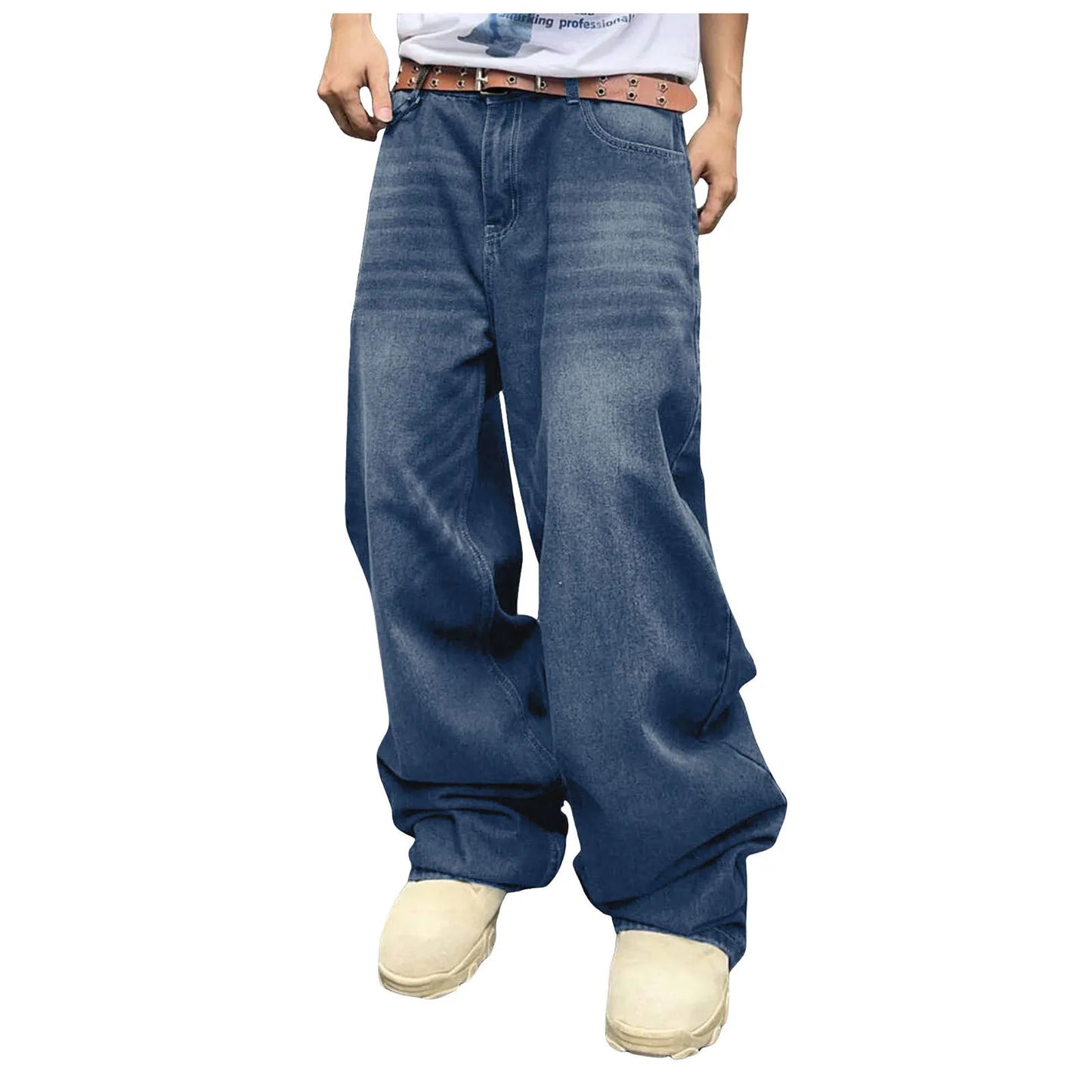 Men's Baggy Hip Hop Jeans Wide Leg Skater Denim Pants Casual Loose Fit Long Trousers Streetwear