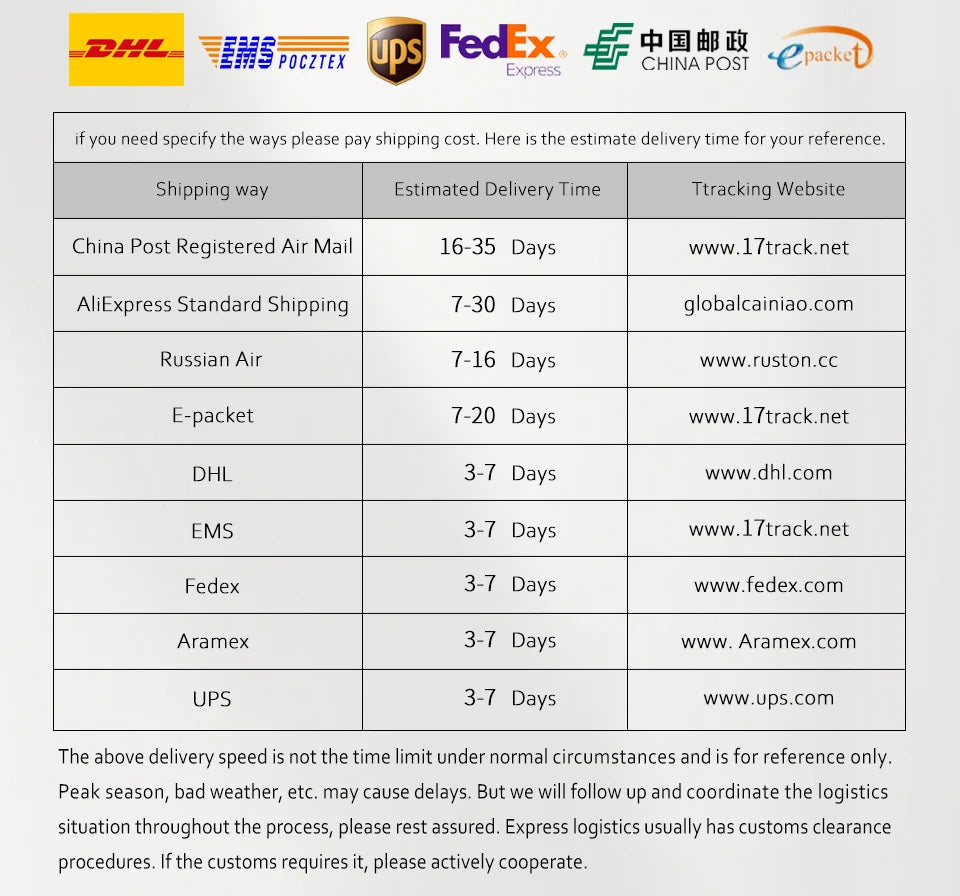 Generally speaking, after you make the payment, our products can be shipped within 1-48 hours or even faster.Whether you need help before or after purchase, please feel free to contact our online customers. We will reply to your message within 1-24 hours.