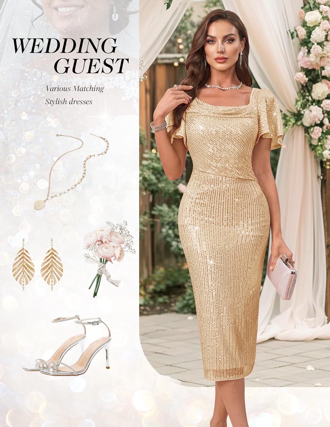 - Features: Designed with ruffle sleeves and a ruched waist, this bodycon sequin dress hugs your curves in all the right places. The back slit design and elegant details not only add a touch of sophistication but also ensure greater freedom of movement, making it a standout choice for any special event.