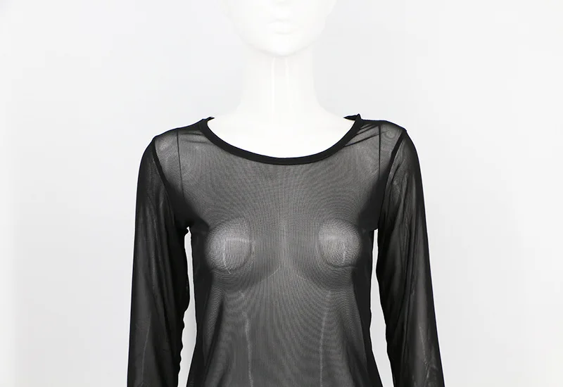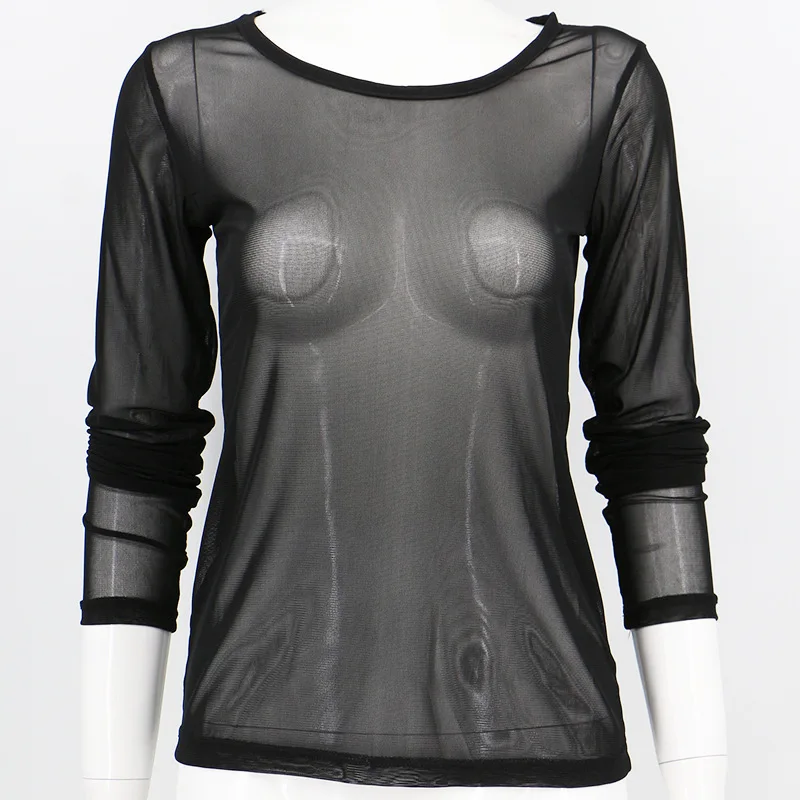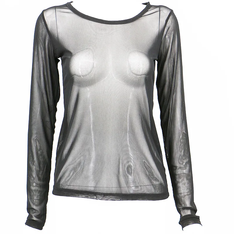 Black Mesh Transparent Slim T-shirts O-Neck Long Sleeve Super Stretch Mesh