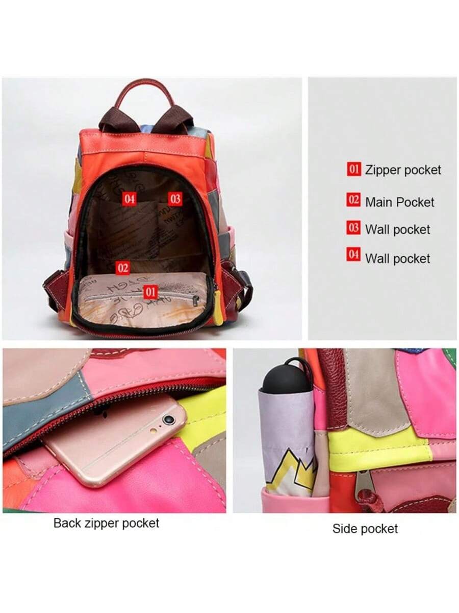 Travel in style with our chic genuine leather backpack. Made from luxurious cowhide, this spacious bag features a stylish patchwork design, perfect for fashion-forward women. Stay organized and look fashionable while on the go. Upgrade your travel game with our backpack.