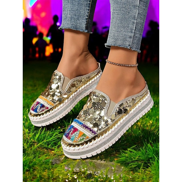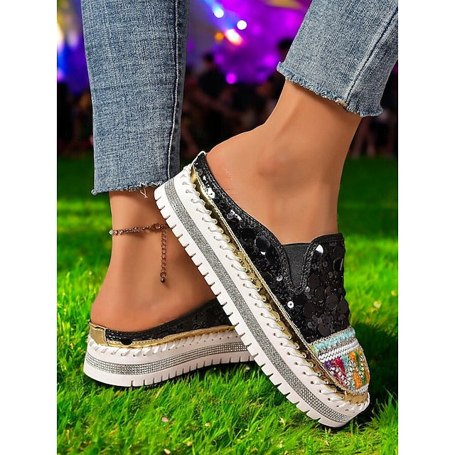 Gender: Women's, Category: Mules, Style: Comfort, Casual, Vacation, Occasion: Travel, Daily, Toe Shape: Round Toe, Upper Materials: Faux Leather, Cloth, Outsole Materials: MD (Phylon), Embellishment: Sequin, Pattern: National Totem, Closure Type: Loafer, 2024 Trends: Platform Sneakers, Heel Type: Platform, Flat Heel,