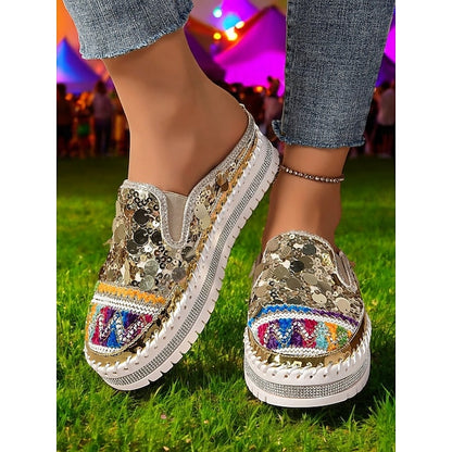 Chic National Totem Sequin Platform Mules: Stylish & Comfortable Faux Leather Sneakers