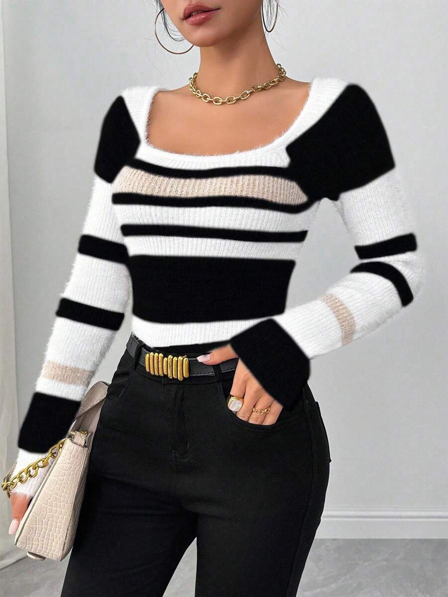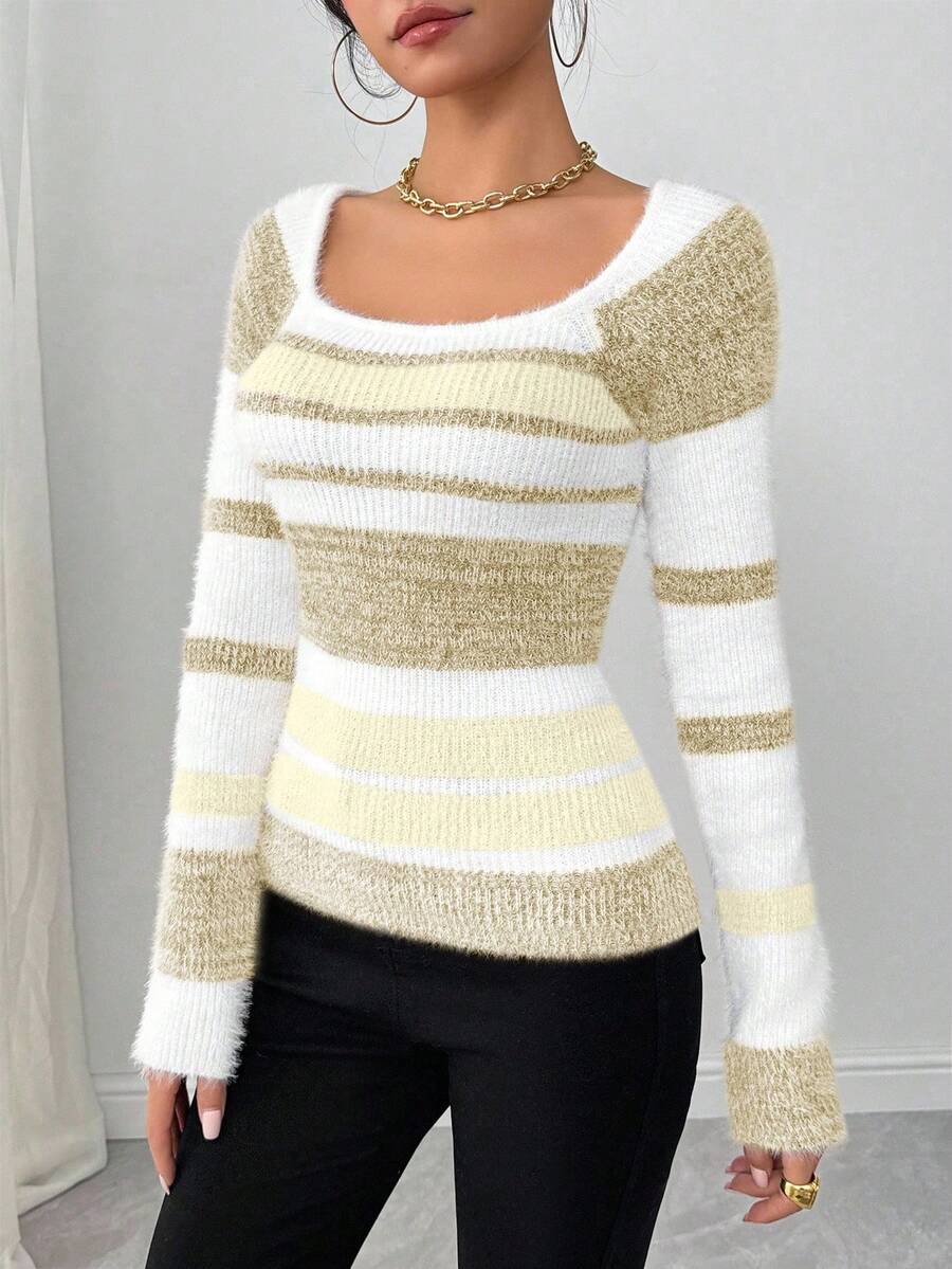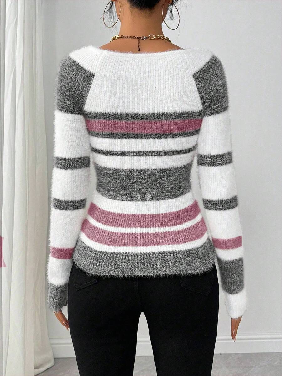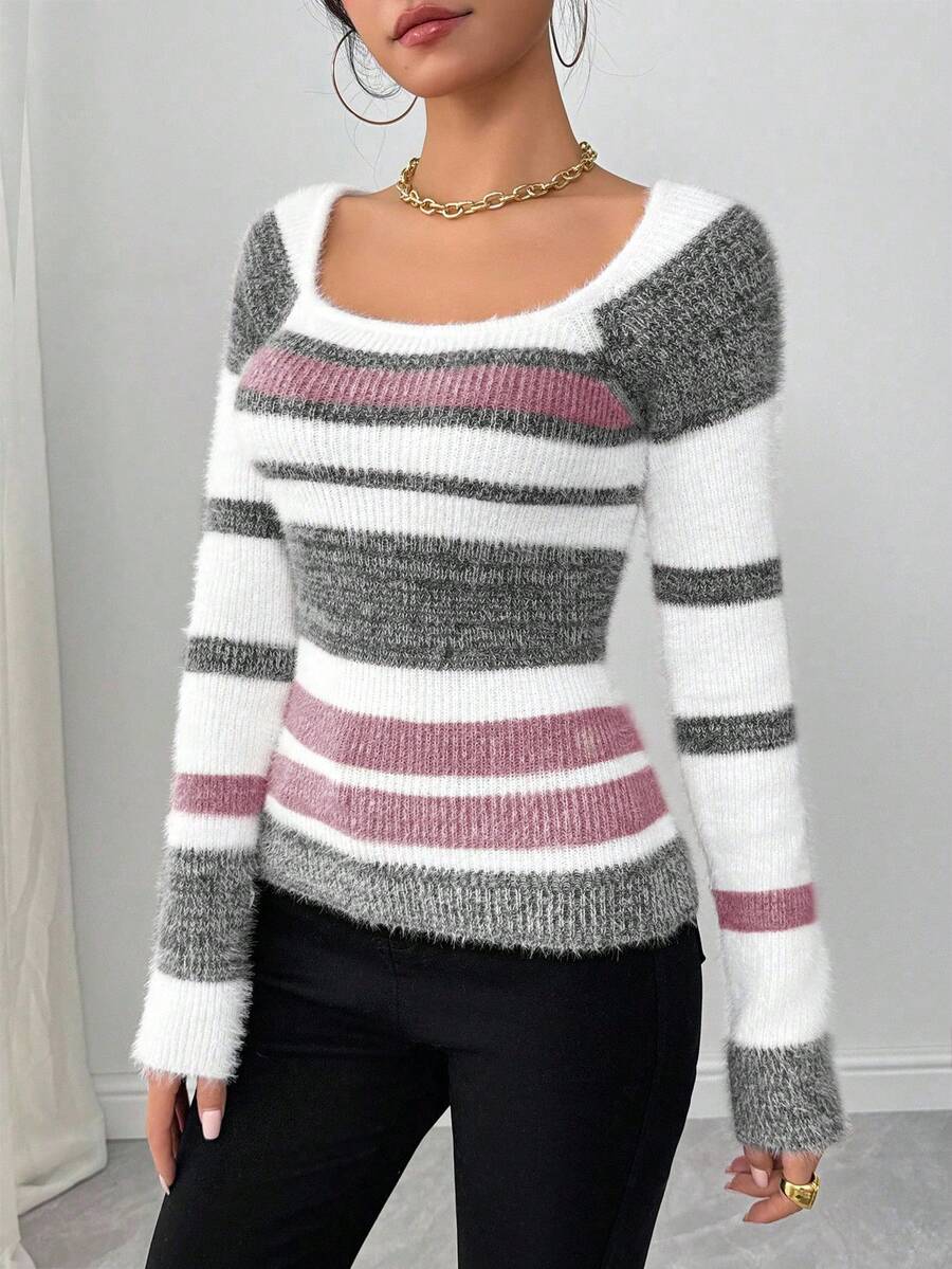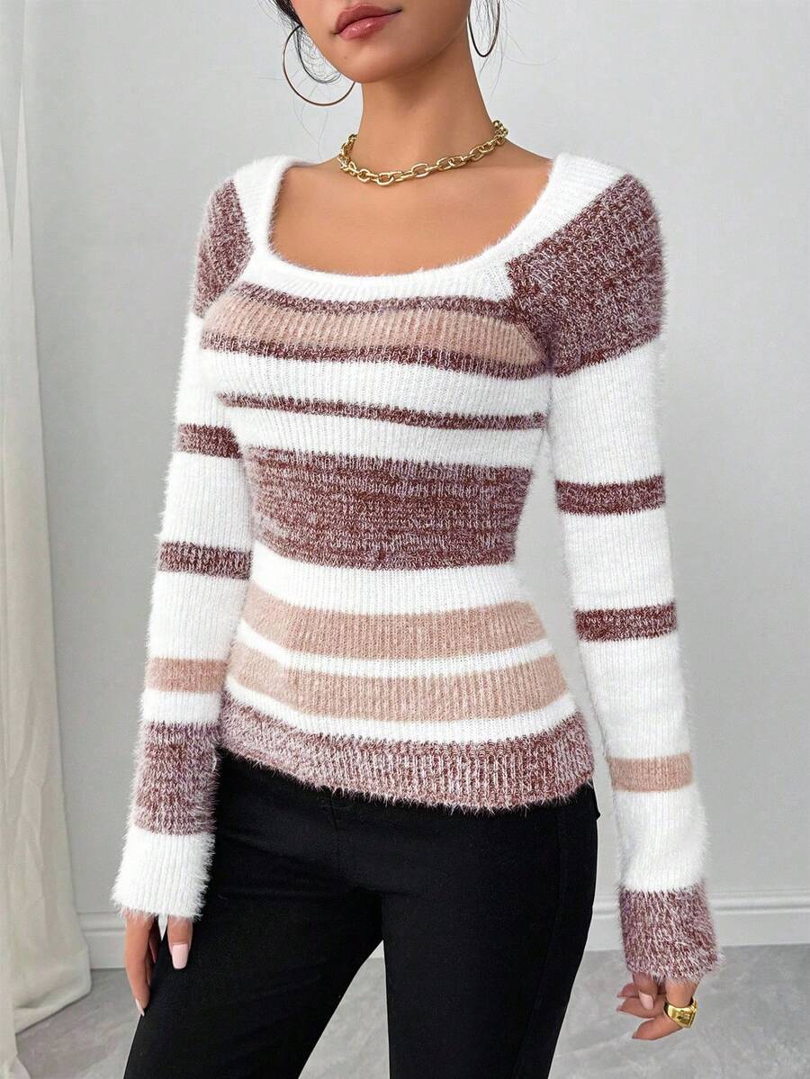 Chiquease Autumn-Winter Casual Contrast Stripe Fitted Long Sleeve Sweater – Perfect Knit Pullover for Fall Outfits