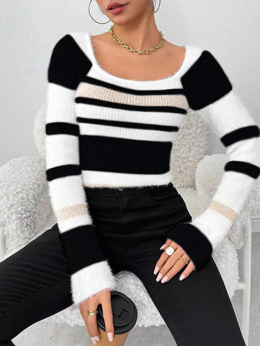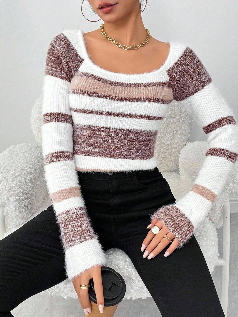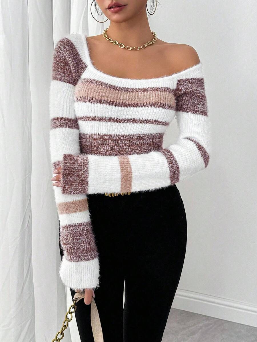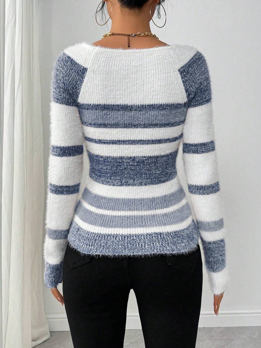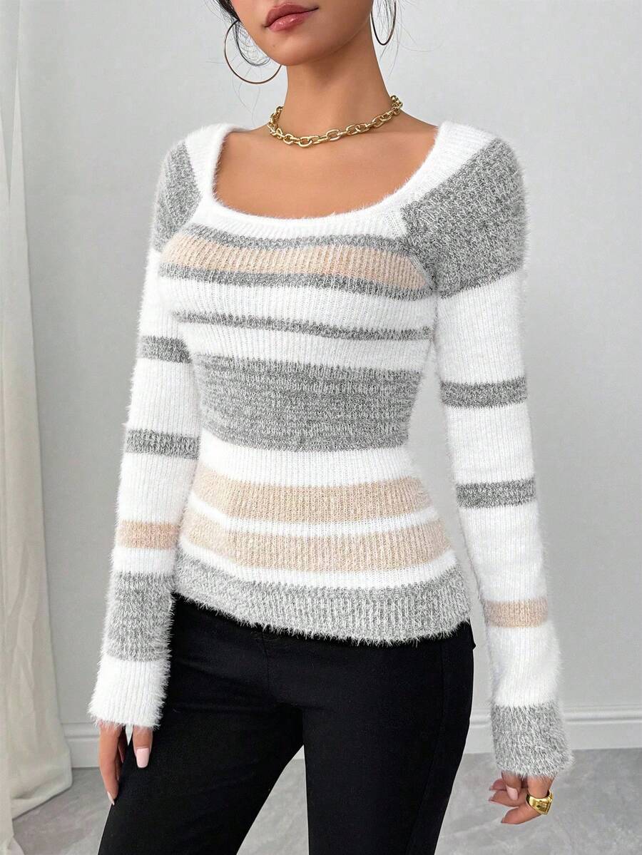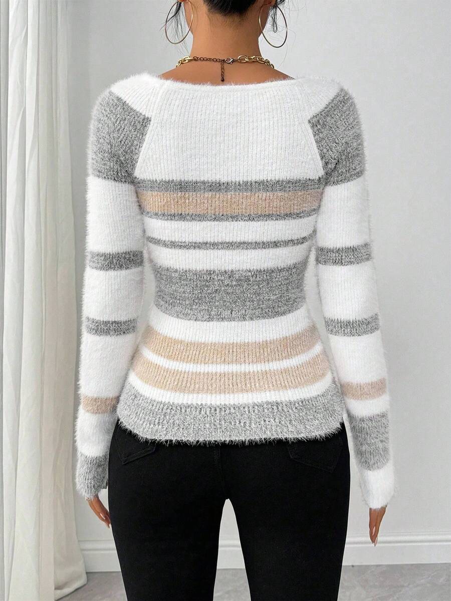 Chiquease Autumn-Winter Casual Contrast Stripe Fitted Long Sleeve Sweater – Perfect Knit Pullover for Fall Outfits