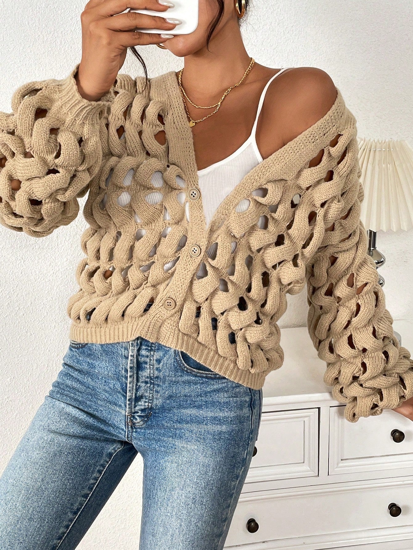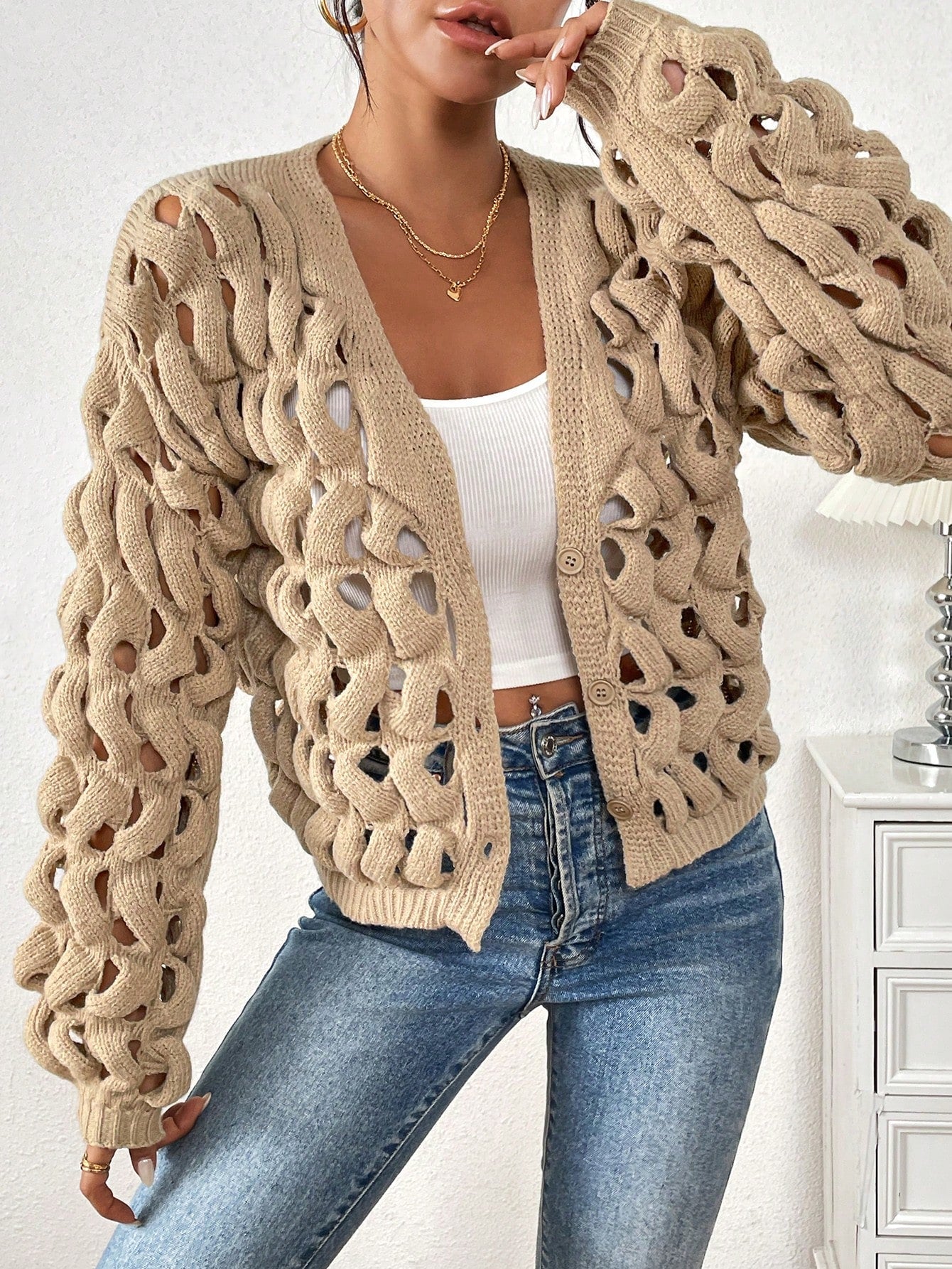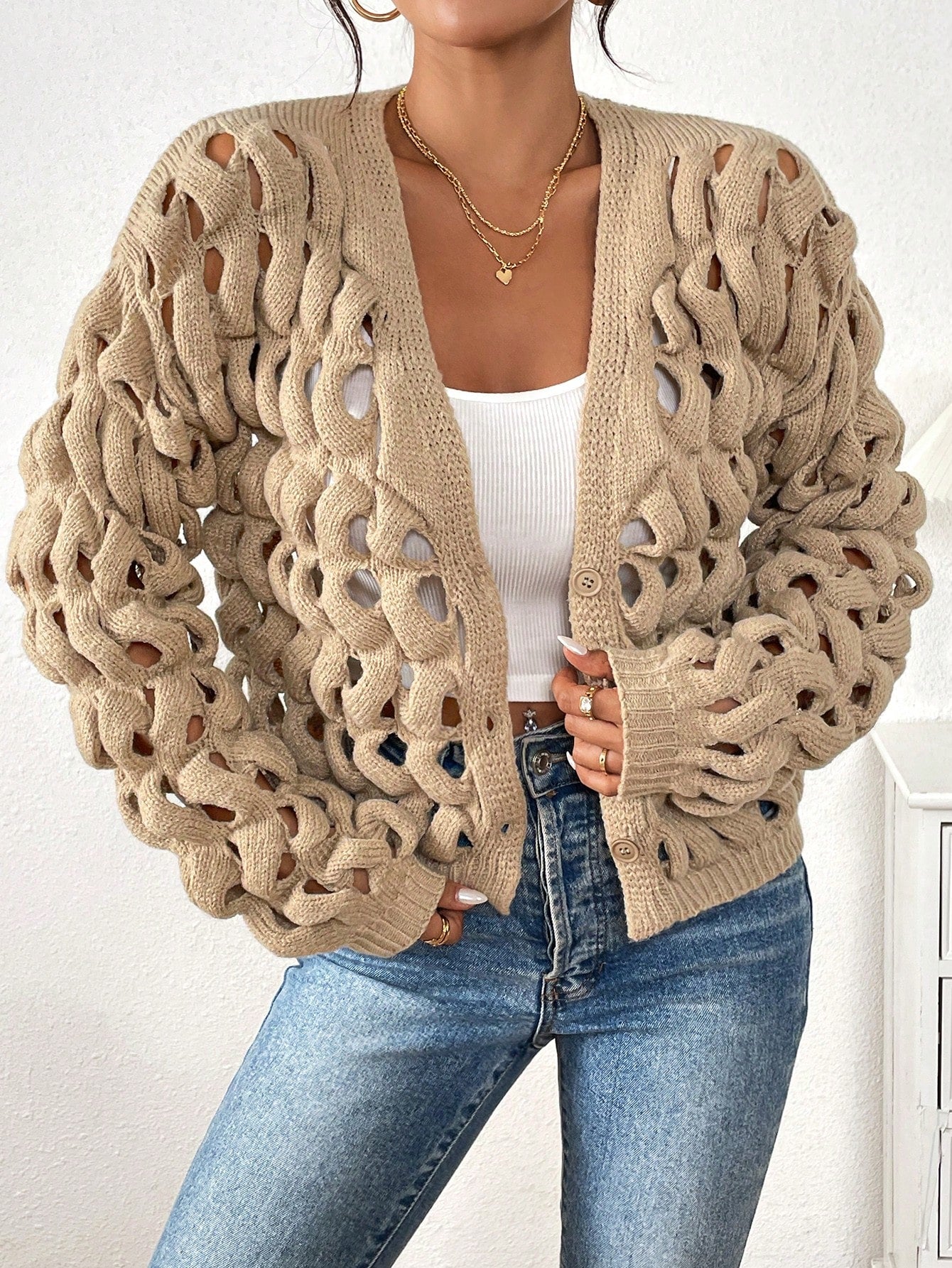 Chiquease Women's Long Sleeve Cable Knit Hollow Out Cardigan for Stylish Fall & Winter Fashion