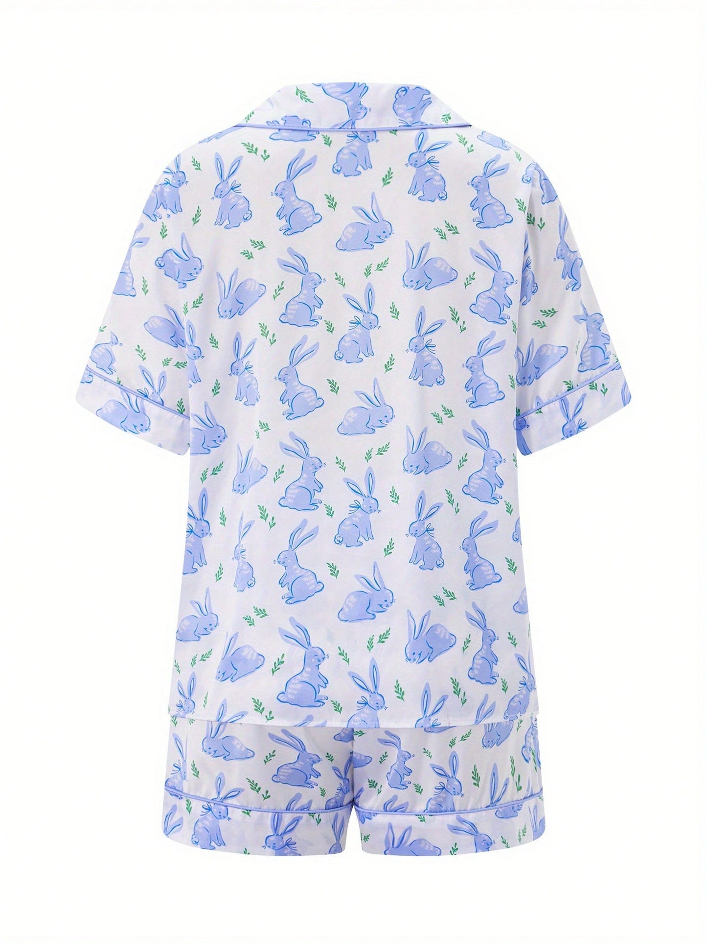 Cute Bunny Print Easter Pajama Set for Women - Short Sleeve Button Down