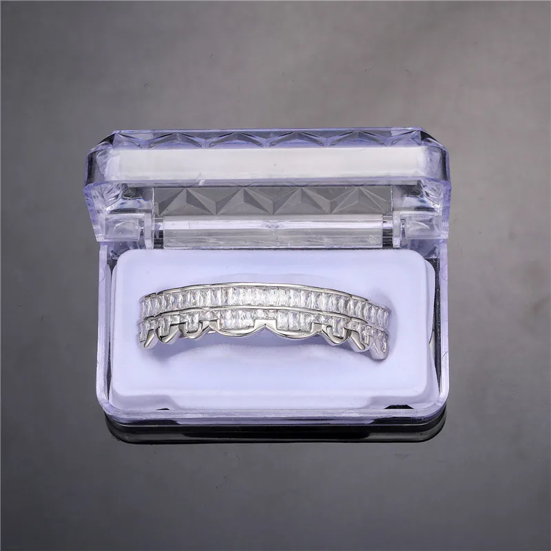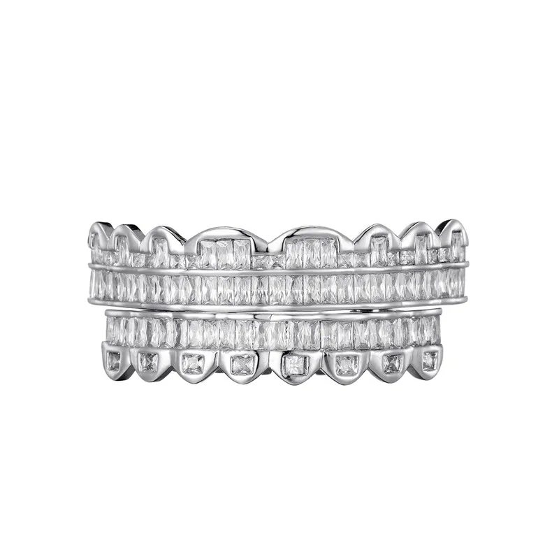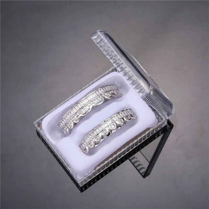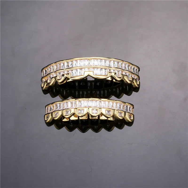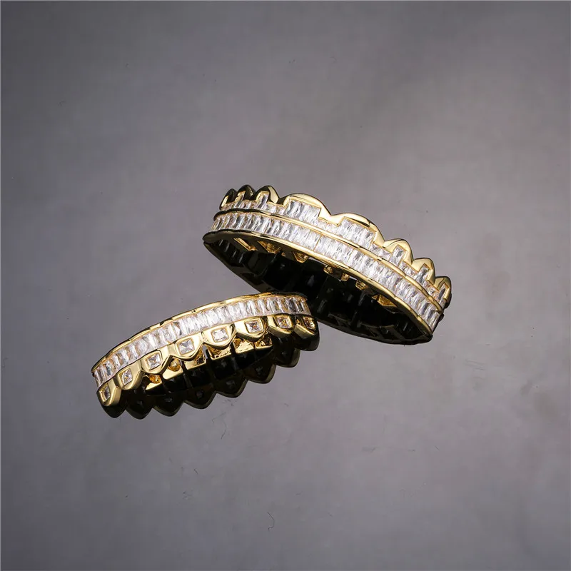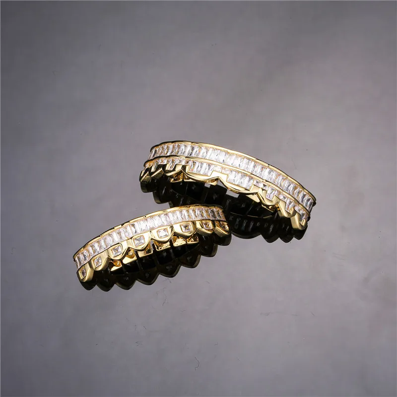 Baguette Teeth Grillz Set For Unisex Top Bottom Iced Out Cubic Zircon Stone Brass Material Hip Hop