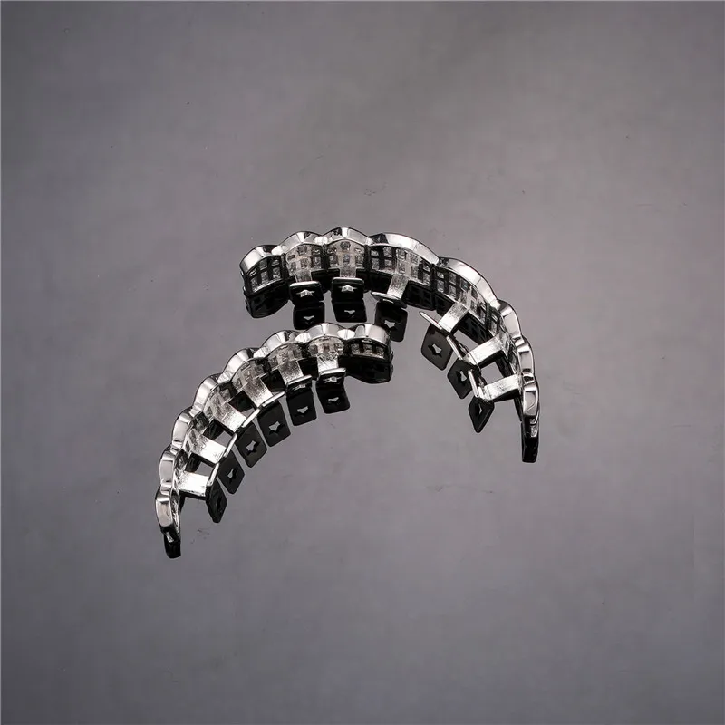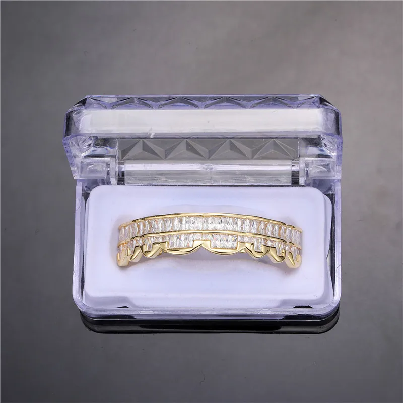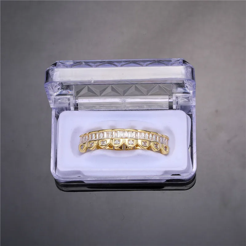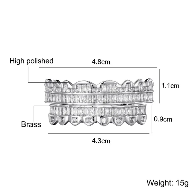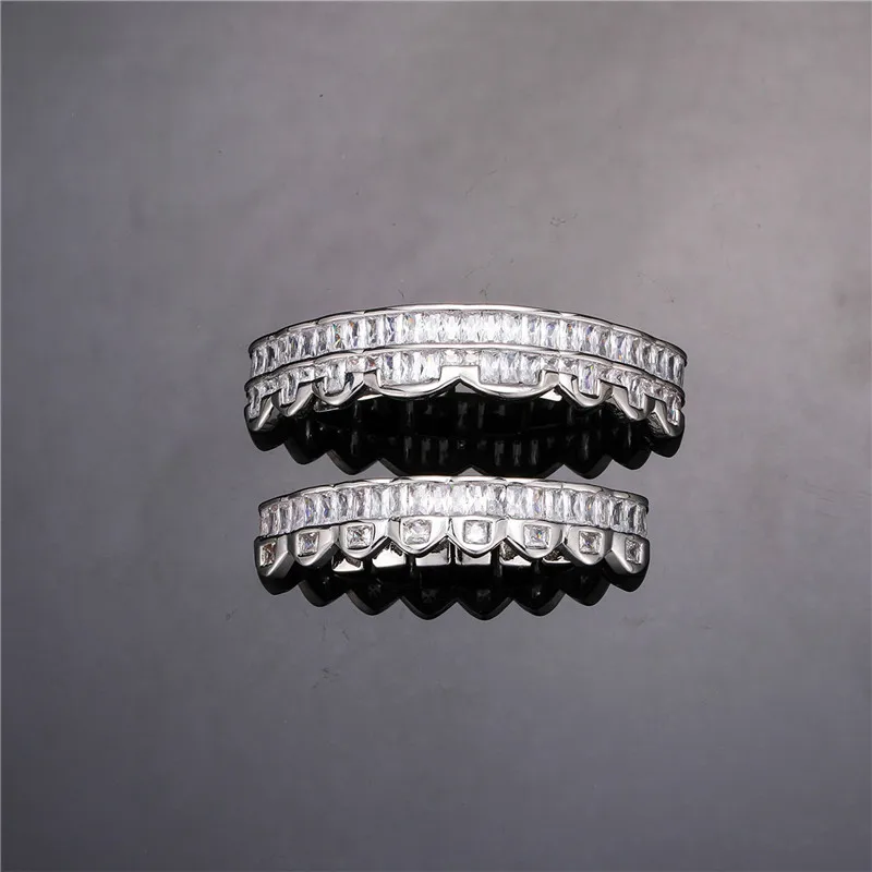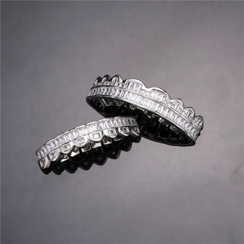 Baguette Teeth Grillz Set For Unisex Top Bottom Iced Out Cubic Zircon Stone Brass Material Hip Hop