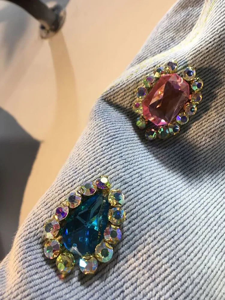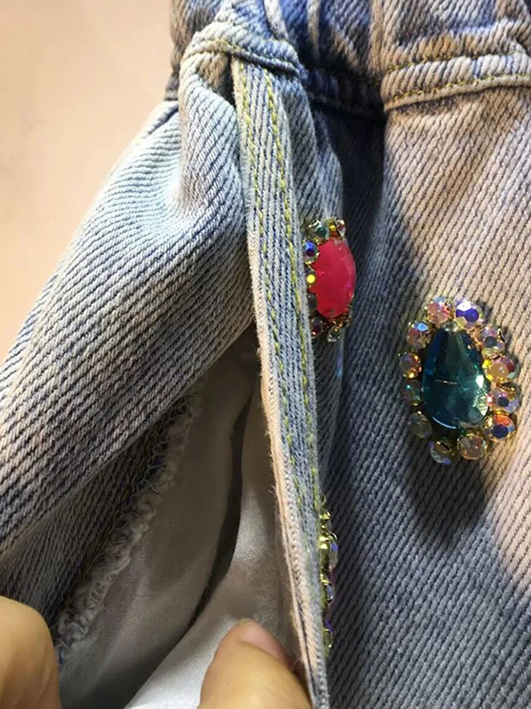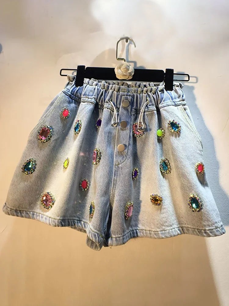 Women's Denim Shorts Colored Big Diamonds Drawstring Elastic Waist Wide Leg Short Pants