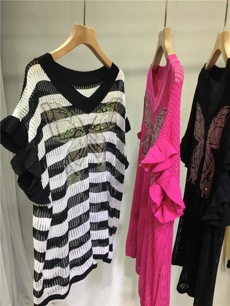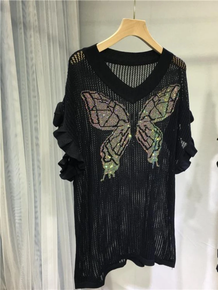 Knitted Thin Tees Hollow Out V-neck Butterfly Casual Y2k Tops Fashion Ruffles Korean T Shirt