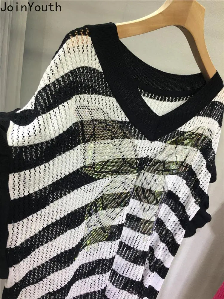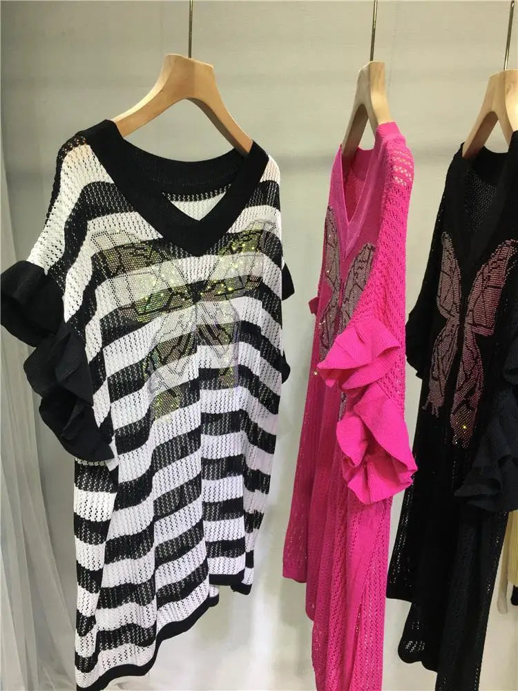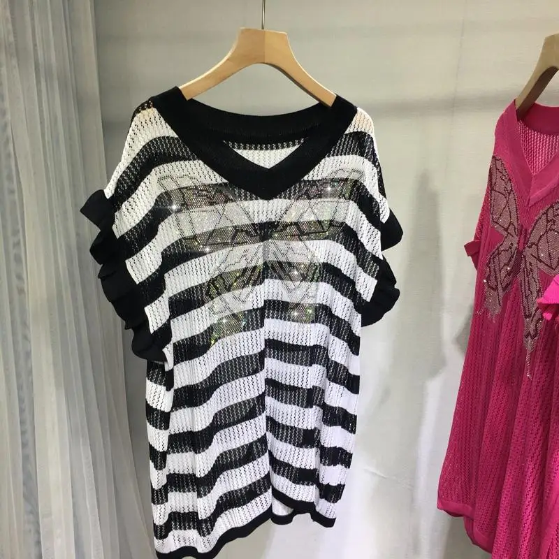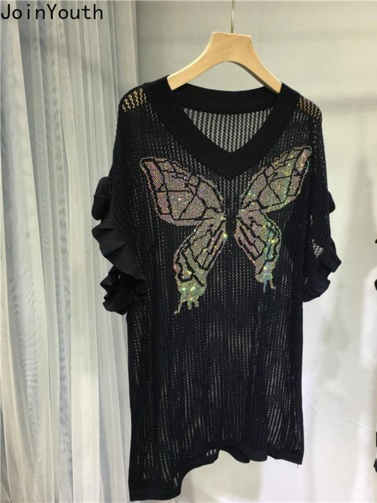 Diamond Oversized Tshirts for Women Knitted Thin Tees Hollow Out V-neck Butterfly Casual Y2k Tops Fashion Ruffles Korean T Shirt