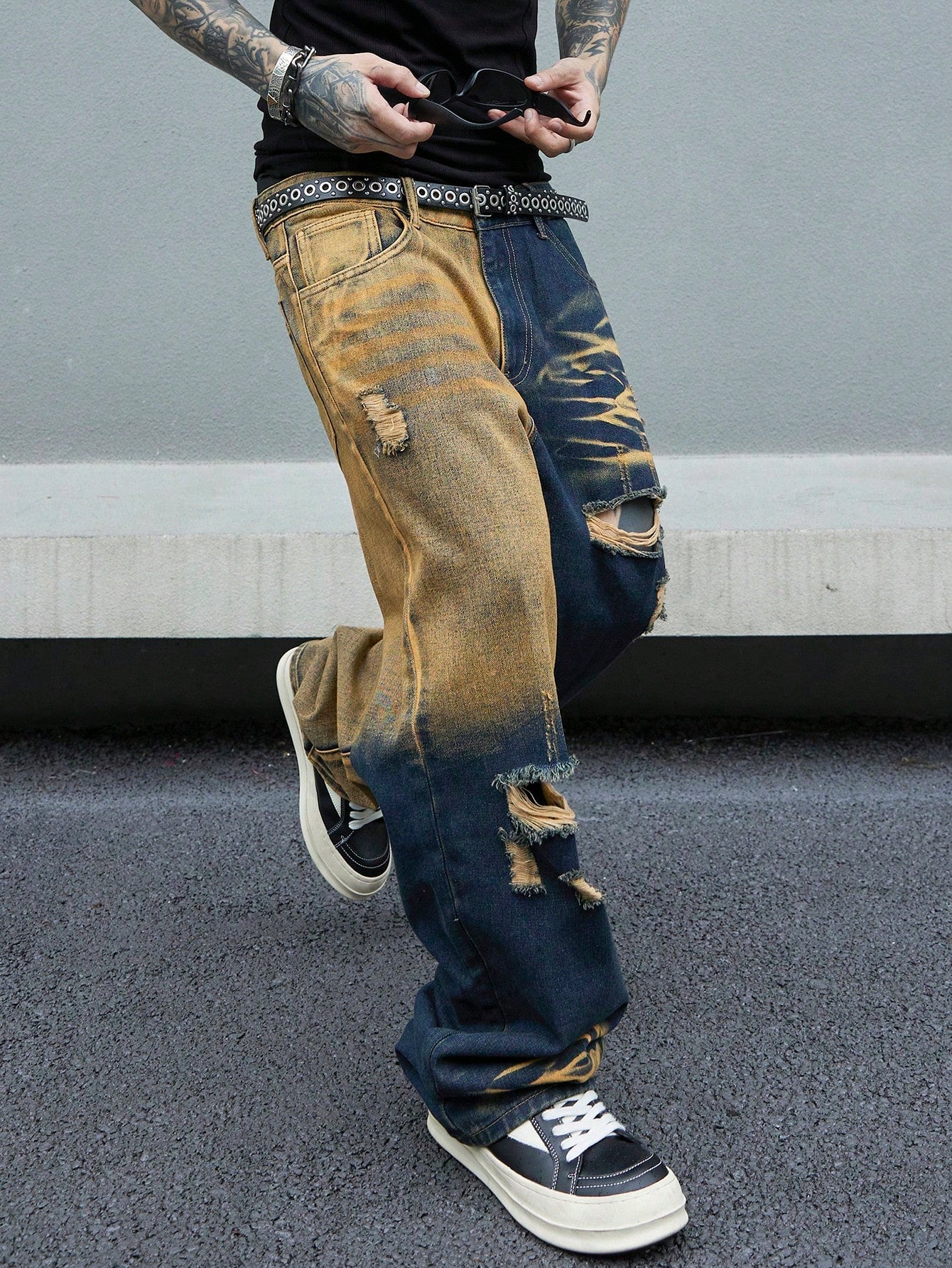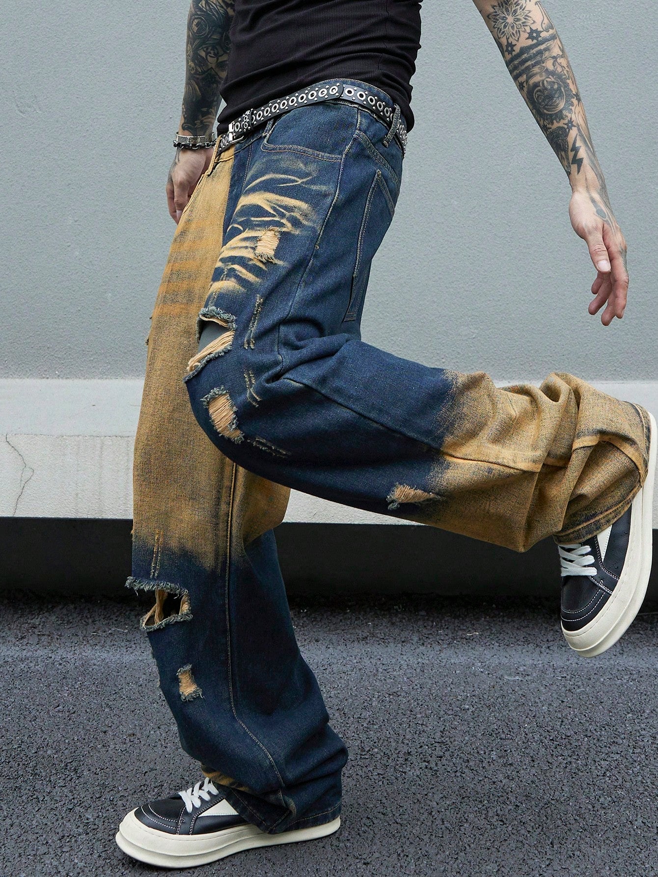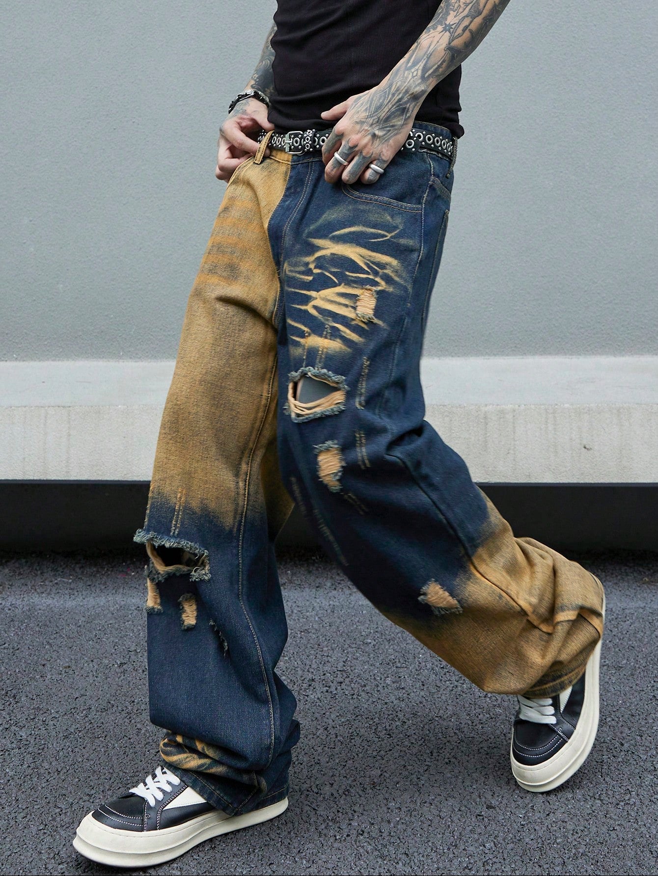 Distressed Dark Blue Straight Leg Ripped Jeans for Men - Trendy Baggy Cargo Style Perfect for Parties and Casual Outings