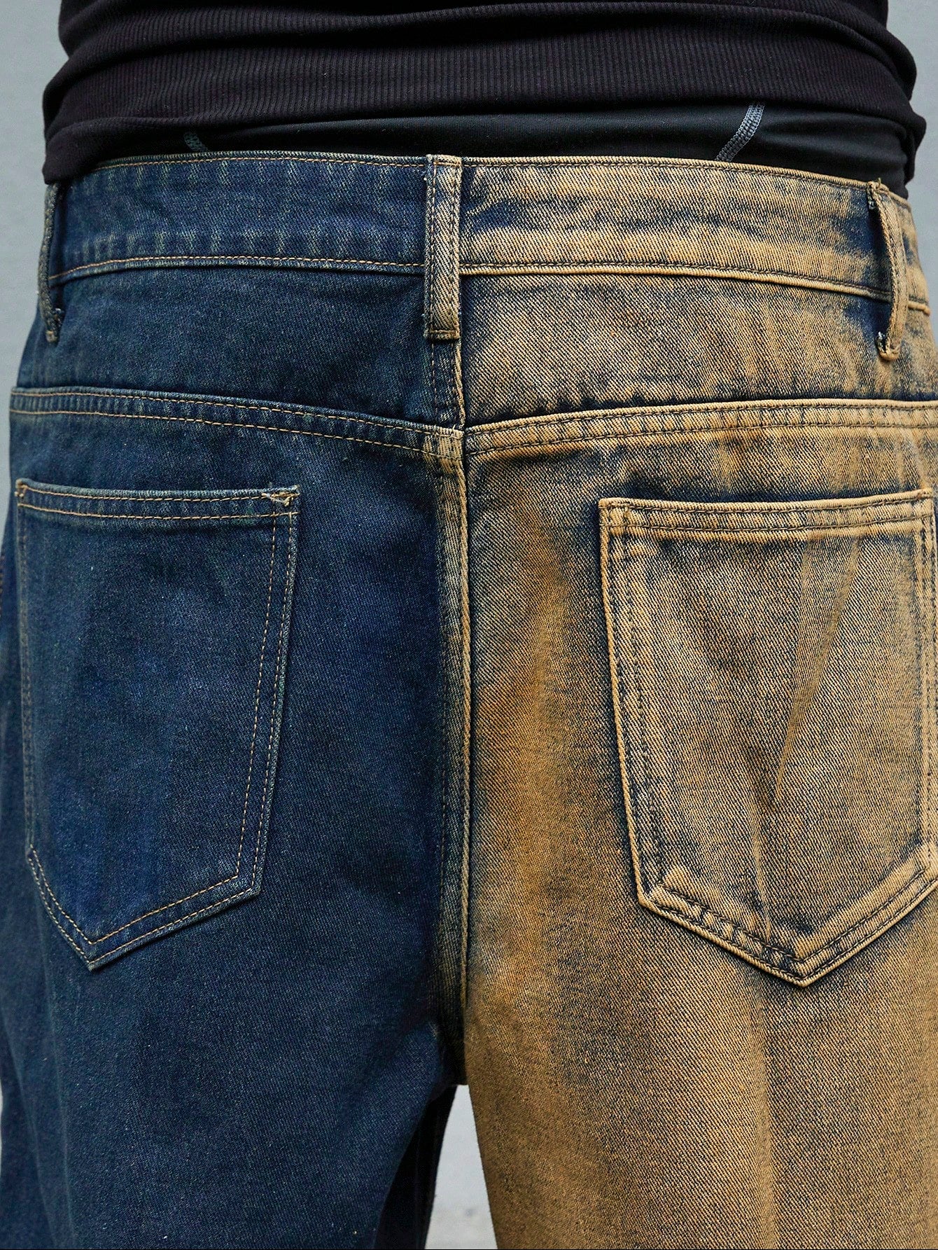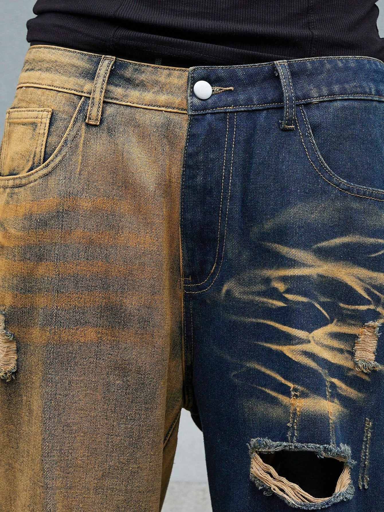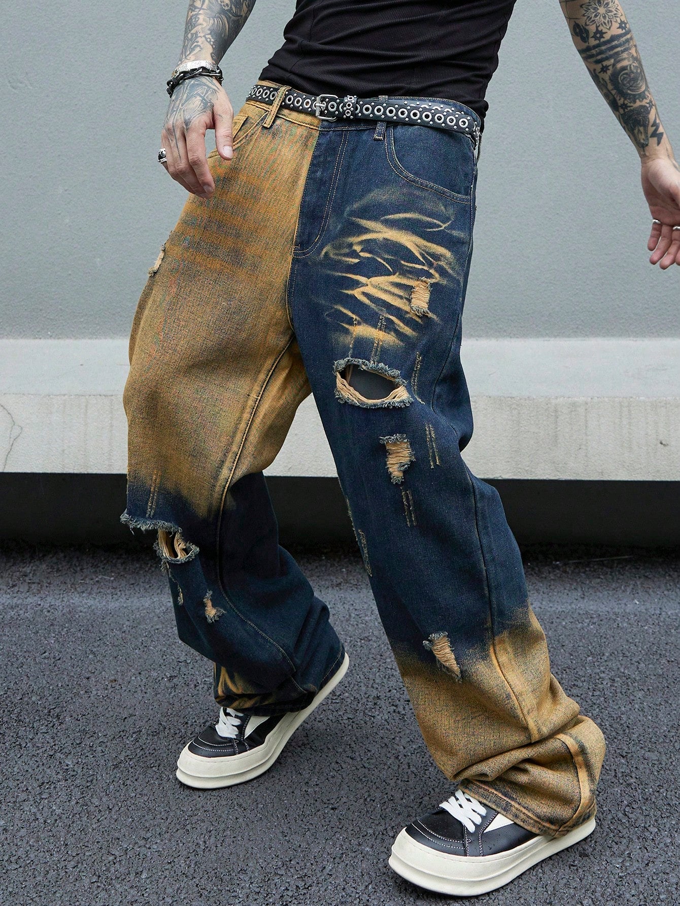 Distressed Dark Blue Straight Leg Ripped Jeans for Men - Trendy Baggy Cargo Style Perfect for Parties and Casual Outings