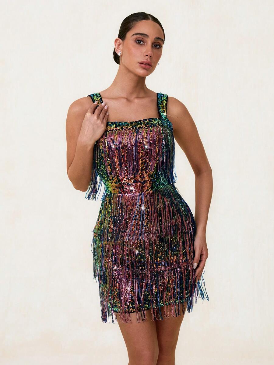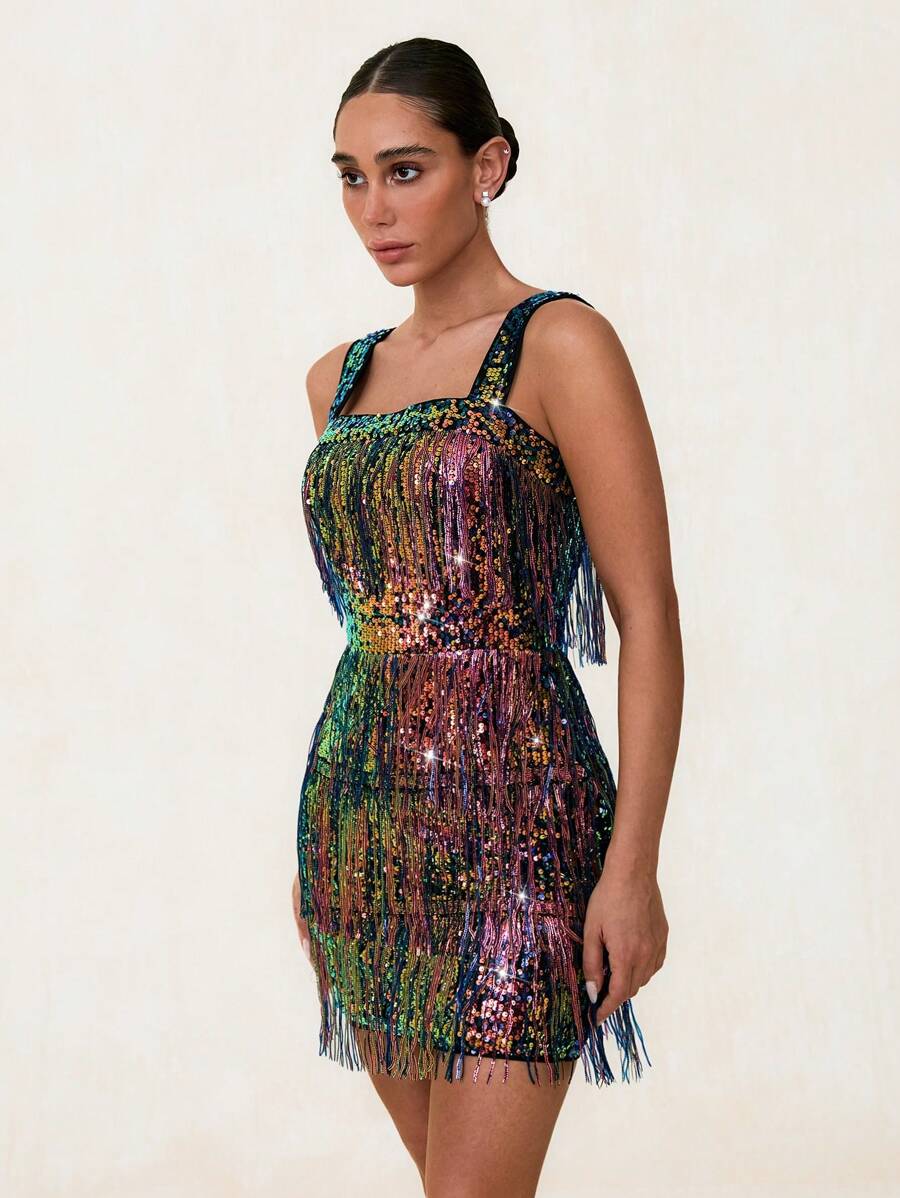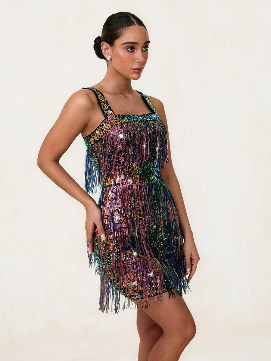“Elegant Green Sequin Backless Summer Dress with Tassels – Perfect for Parties and Graduations”