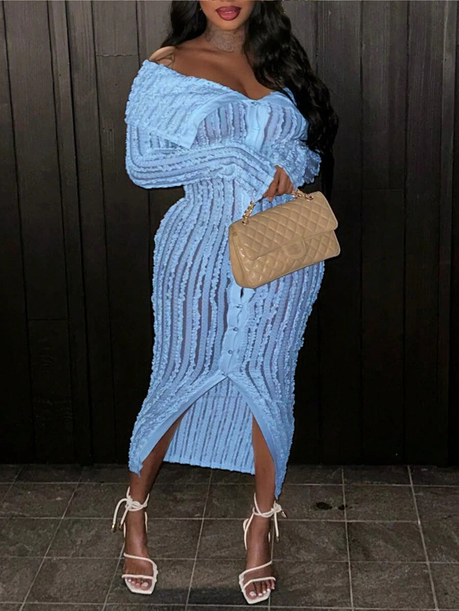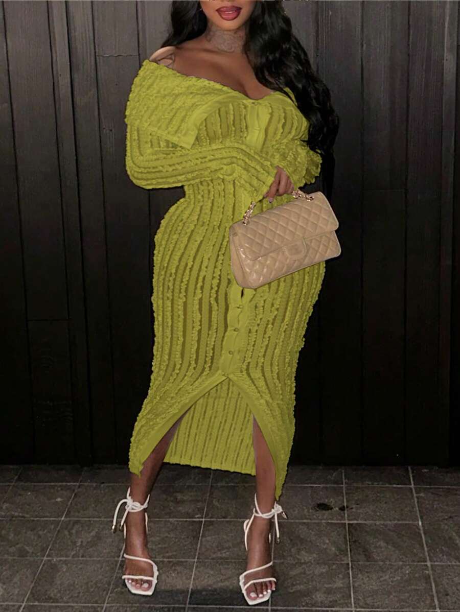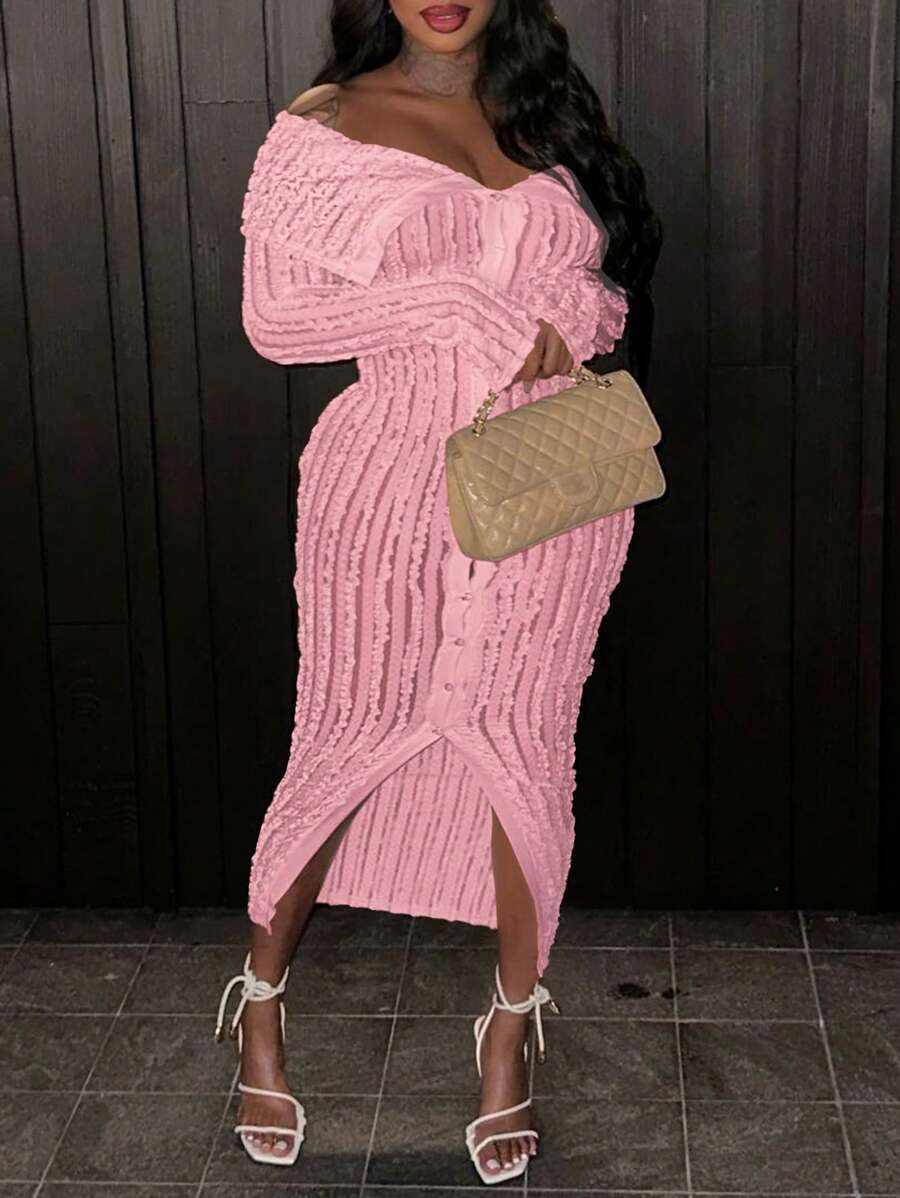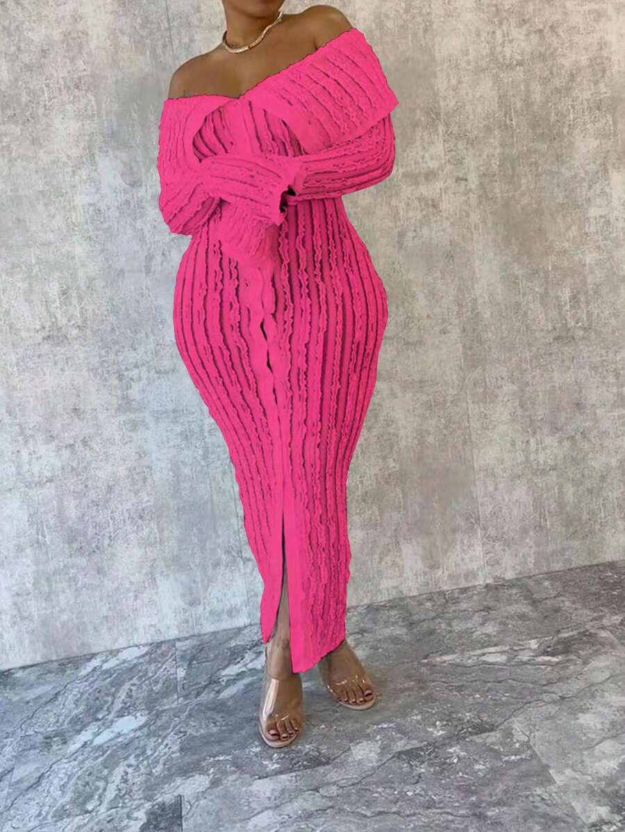 Elegant Off-Shoulder Jacquard Knit Dress with High Split - Perfect Bodycon Outfit for Night Out Events